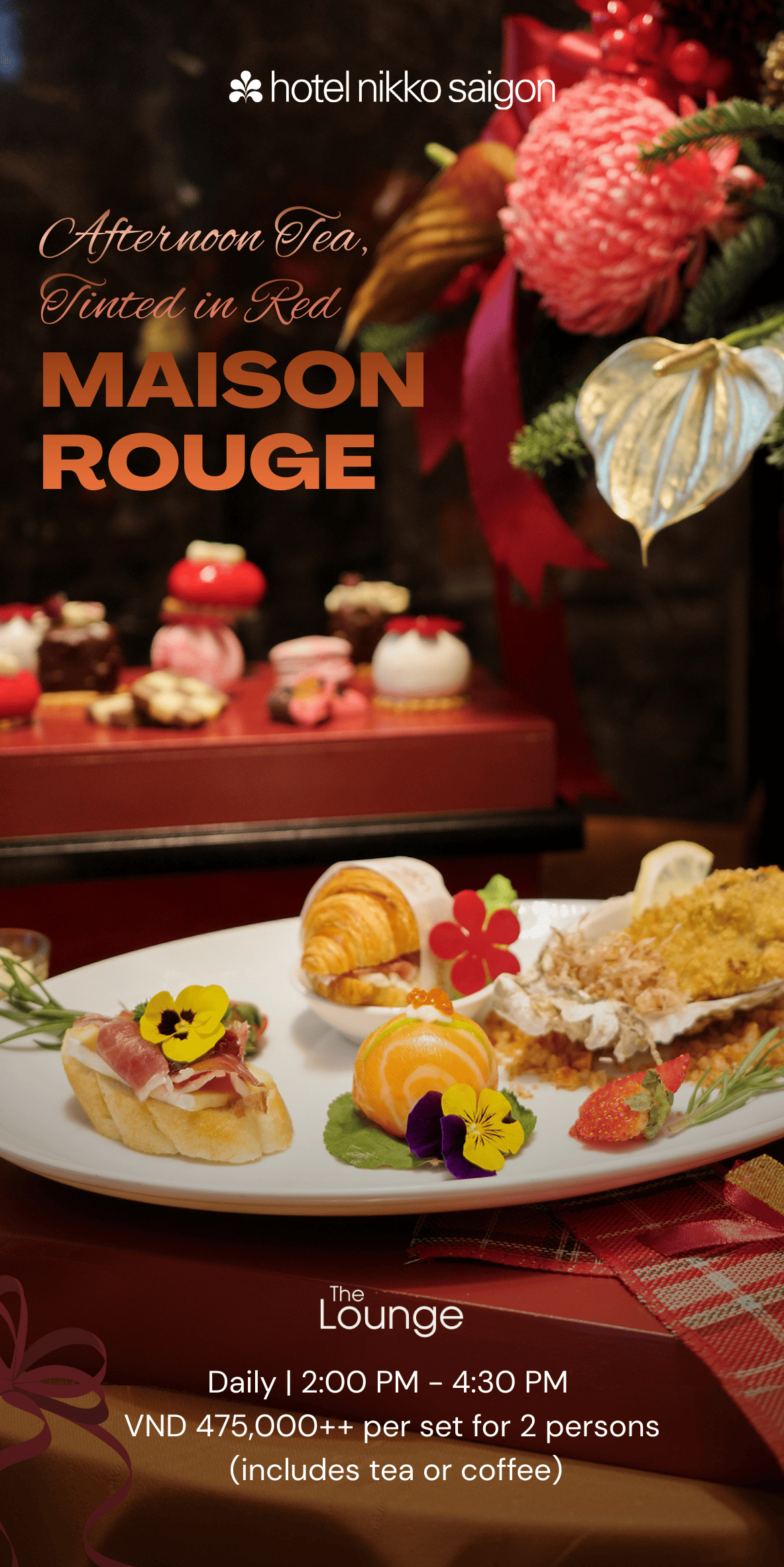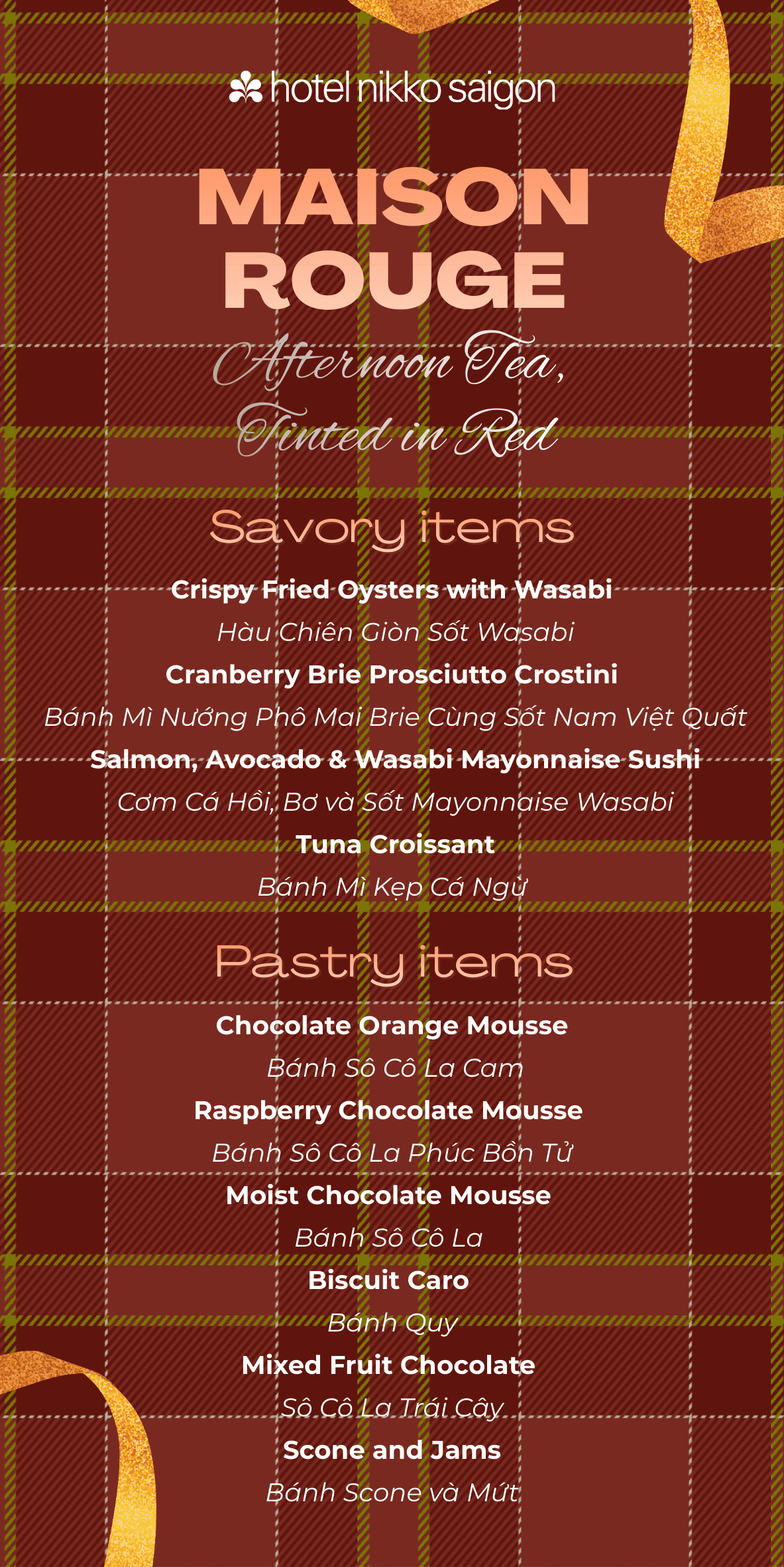 赤の彩りに包まれた Maison Rouge アフタヌーンティー は、心満たされる午後のロマンを映し出します。 味わいと食感が美しく調和し、上質な優雅さとぬくもり、そして静かなつながりを感じるひとときへと誘います。